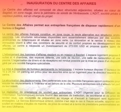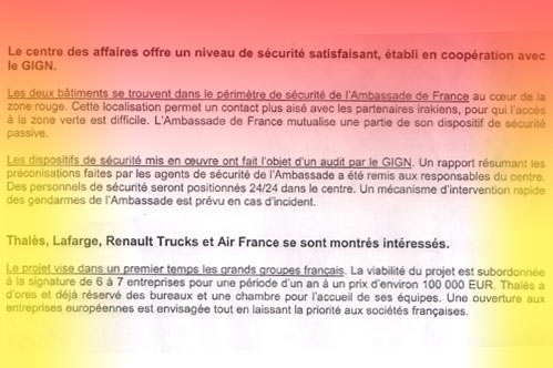 Le site "Alintiqad" a obtenu, via son correspondant à Paris, une copie du document français expliquant l'agenda envisagé par la France pour retourner en Iraq à travers l'économie, sans qu'elle ne dérange les américains et les britanniques. Ce document comprend une explication détaillée du centre d'affaires que prétend construire le gouvernement français à côté de l'ambassade de la France au sein de la capitale irakienne. Selon le document, le centre qui servira d'une zone "rouge" serait protégé par des forces de l'unité d'intervention rapide de la gendarmerie française.