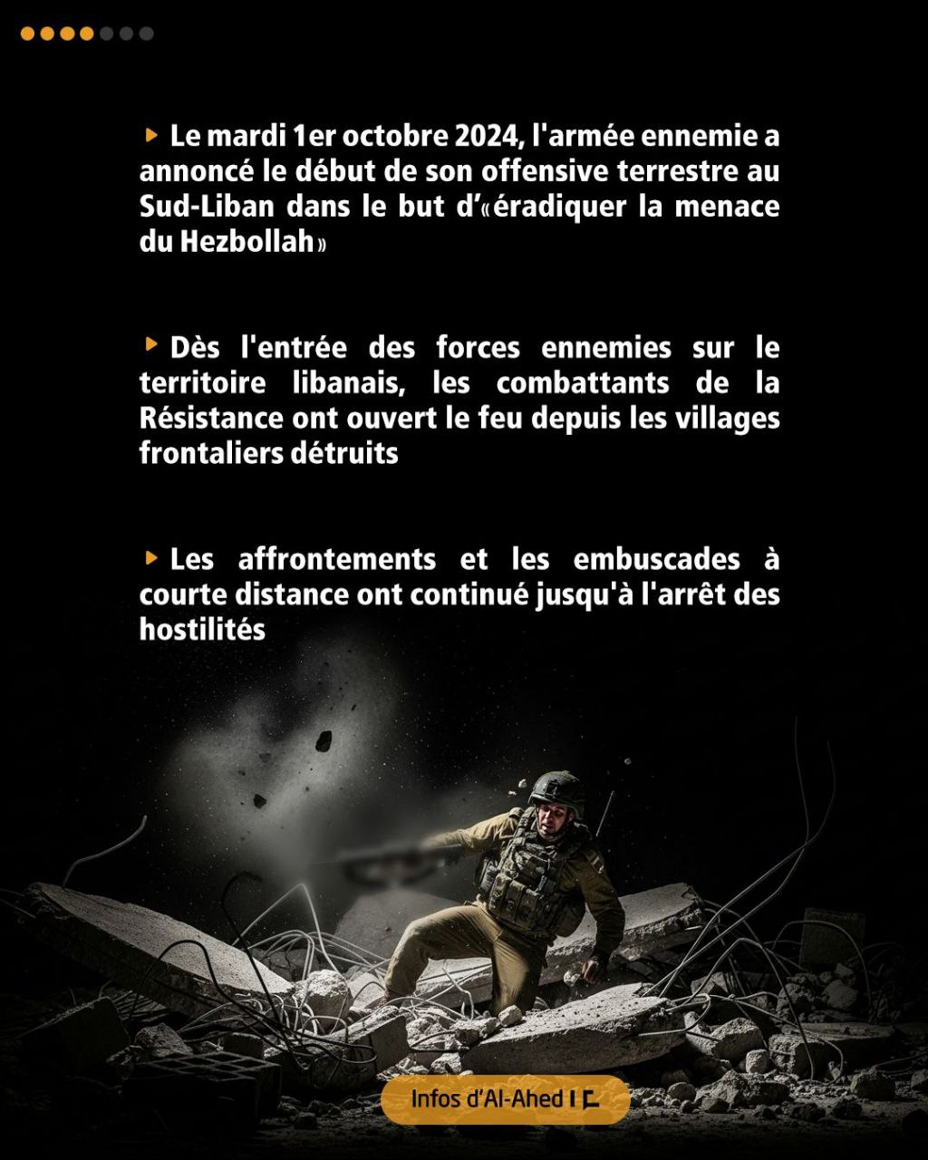 Le 1er octobre 2023, «Israël» a lancé une offensive terrestre au Liban-Sud, dans le but d’«éradiquer la menace du Hezbollah», mais elle a voué à l’échec face à la résistance légendaire.