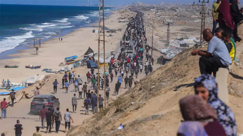 A la mi-journée une file de piétons s'étirait, souvent sans effets personnels, si ce n'est des sacs à dos. Quelques véhicules avançaient lentement dans le même sens au milieu de la foule, à Nousseirat, dans le centre de la bande de Gaza.