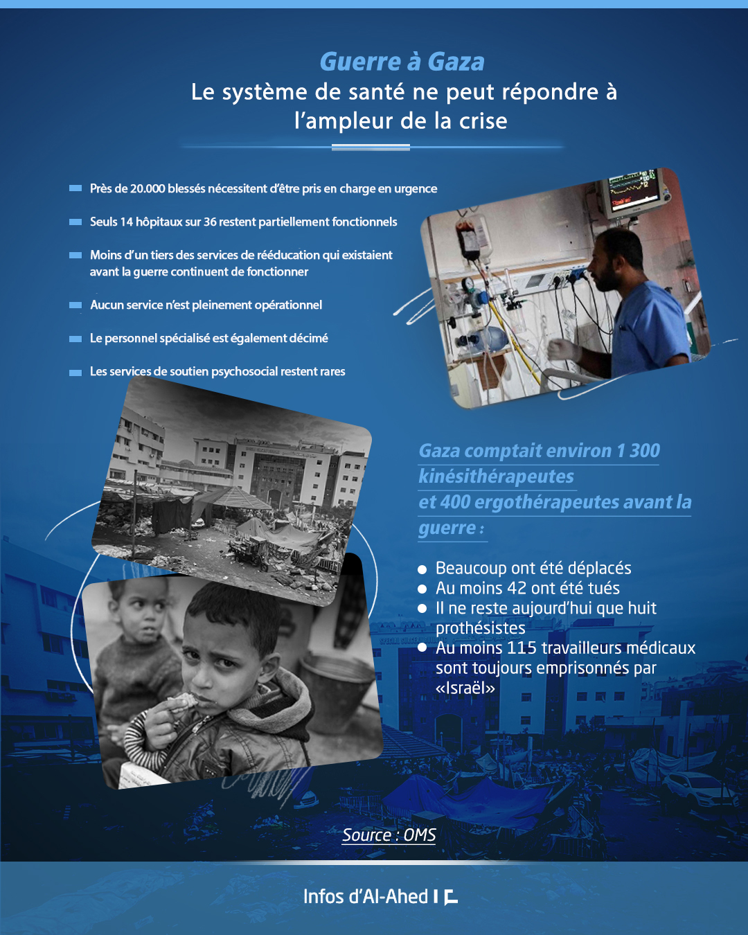 Le système de santé gazaoui, déjà exsangue, ne peut répondre à l’ampleur de la crise. Près de 20.000 blessés aujourd’hui nécessitent d’être pris en charge en urgence et aucun service n’est pleinement opérationnel.