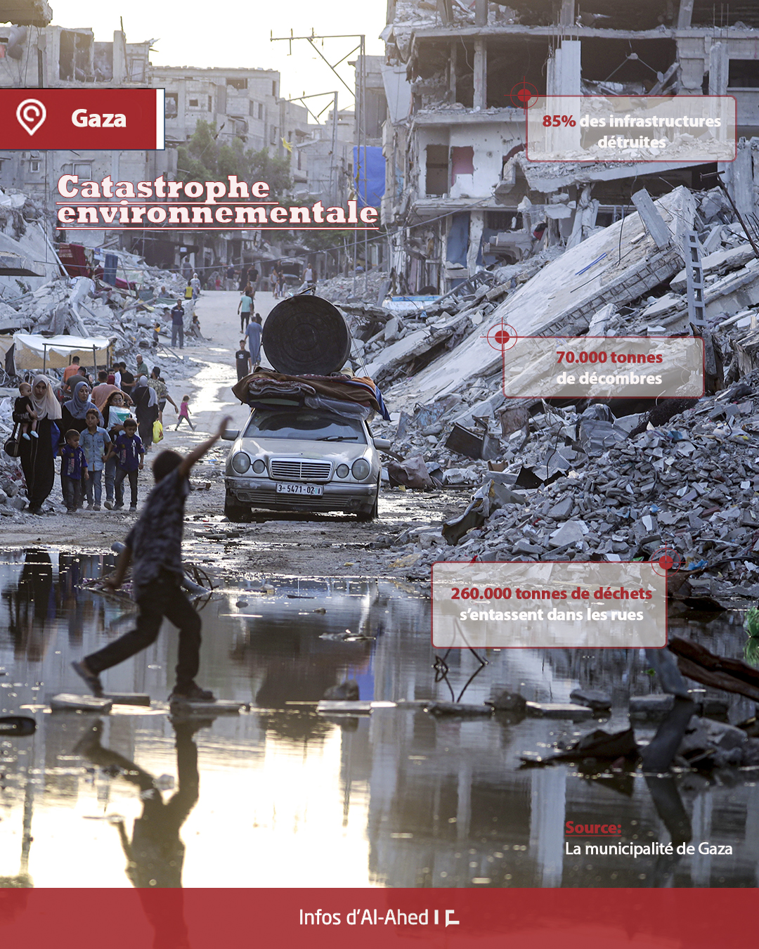 260.000 tonnes de déchets s’entassent dans les rues de l’enclave palestinienne, auxquelles s’ajoutent 70.000 tonnes de décombres, selon la municipalité de Gaza.