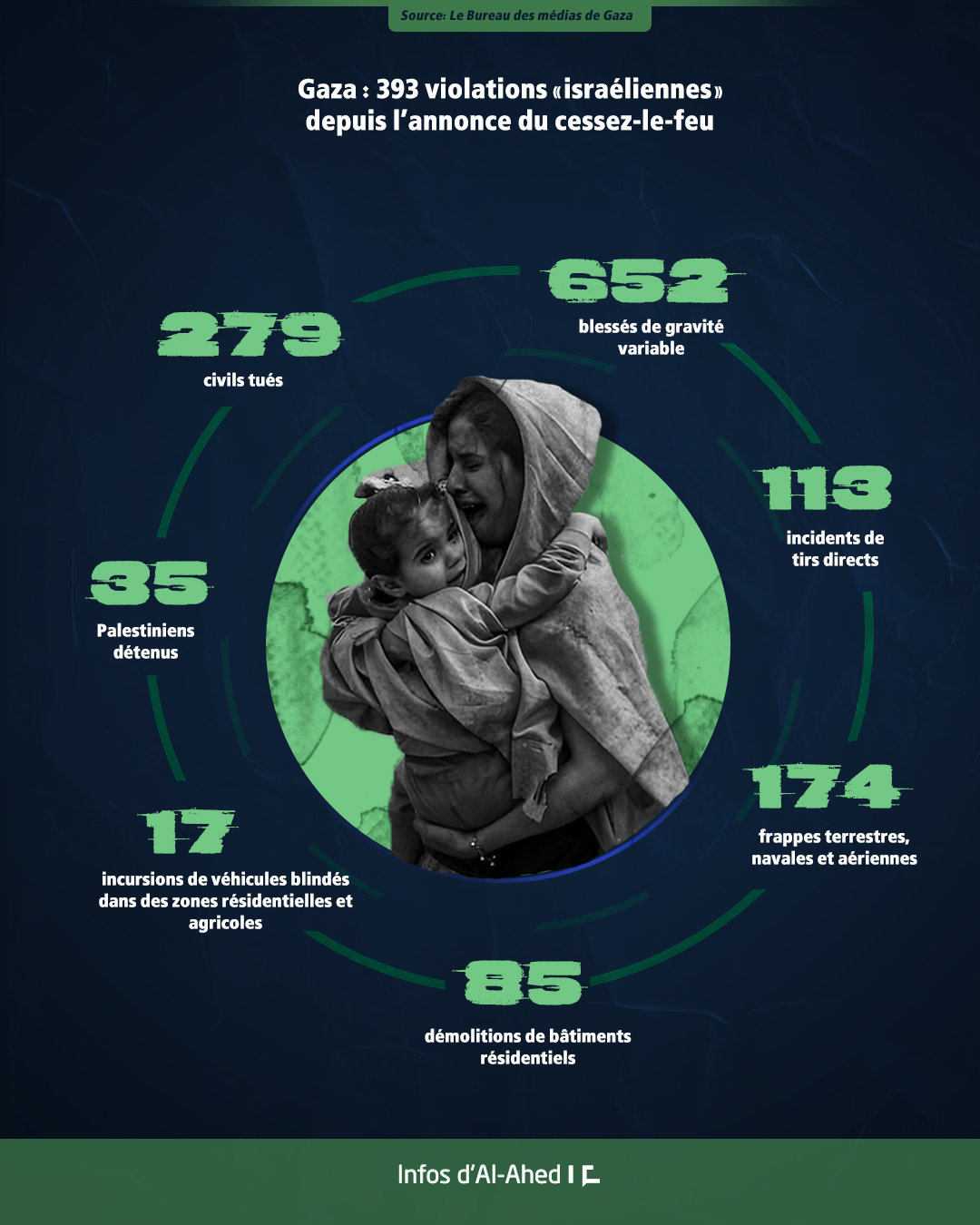Depuis l'entrée en vigueur du cessez-le-feu le 10 octobre dernier, «Israël» a commet 393 violations dans la bande de Gaza, tuant au moins 279 Gazaouis.