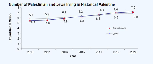 Selon le quotidien hébreu Haaretz, 5,8 millions de Palestiniens vivent actuellement en , contre 6 millions d'Israéliens. En 2016, ces populations devraient atteindre le même nombre d’individus avant de voir les deux courbes se croiser pour atteindre 7,2 millions de Palestiniens en 2020, contre 6,9 millions de sionistes.